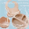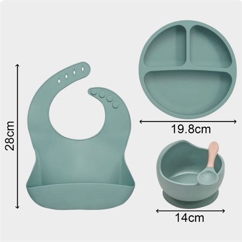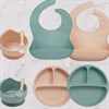 В наборе: силиконовая тарелка на присоске - 300 мл, ложка, нагрудник.