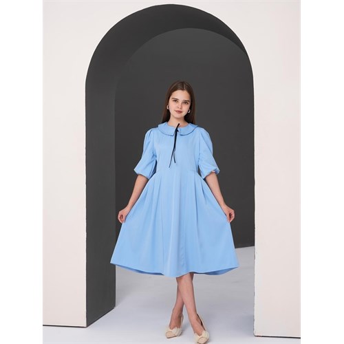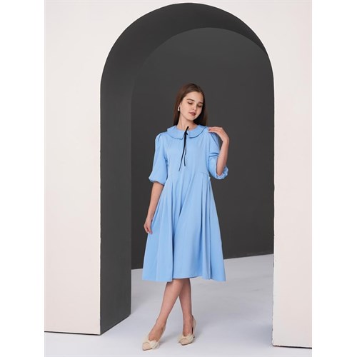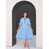 Это платье — словно глоток свежего воздуха. Небесно-голубой оттенок мягко подчёркивает естественную нежность образа, а расклешённая юбка создаёт эффект лёгкости при каждом шаге.