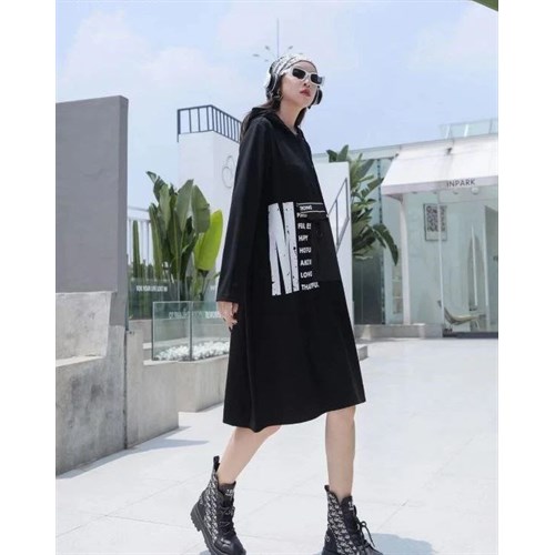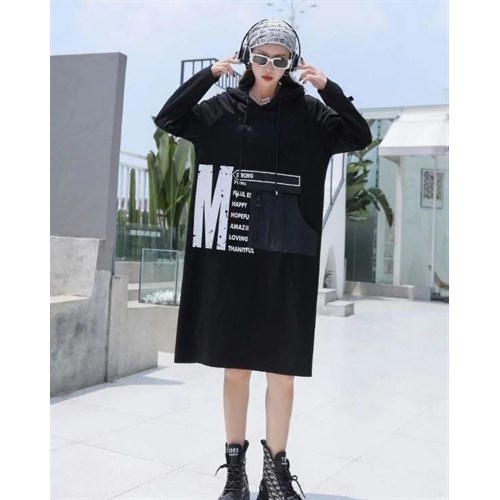 Осеннее платье из плотного трикотажа с ярким белым принтом + Асимметричный карман ...